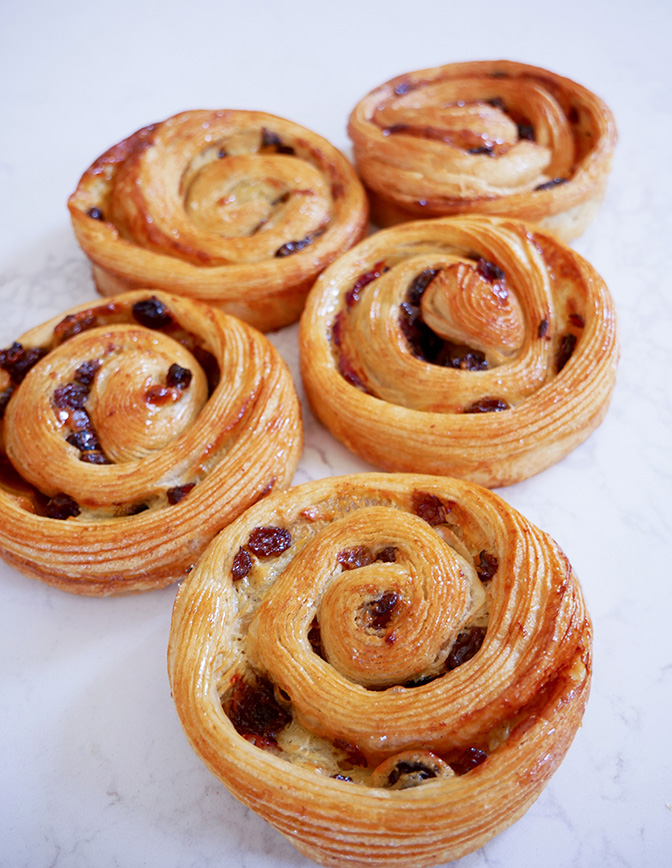 Formado: extender la masa a 0,5 cm , luego enrollar y cortar rodajas del peso deseado (90g). Colocar sobre una bandeja con papel de horno.